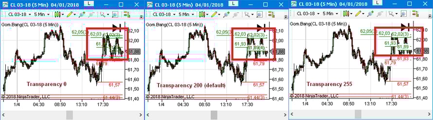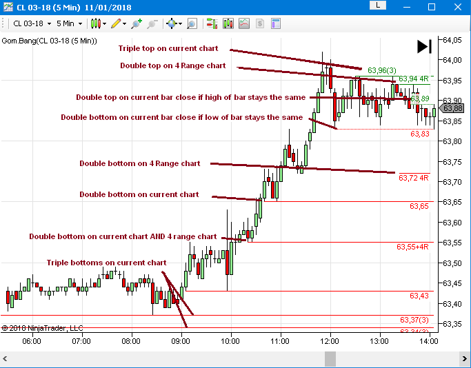 For instance, if it is displayed on 5 minute, a 4 range and a 800 tick chart, then the 5 minute chart will display double/multitop levels from the 5 min, the 4 range and the 800 tick.