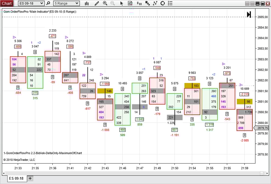 It is now possible to build your own orderflow analysis system, since all the bar buy/sell values are accessible for custom indicator. A sample indicator computing maximum buys and sells in a bar is available here