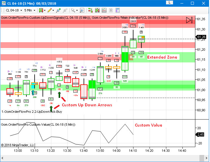 - GomOrderFloPro-Custom-UpDownSignals will show Up and Down symbols , using the formulas you provide. For instance the default setting will show delta divergence, up signal is Close[0] > Open[0] and Delta[0]<0